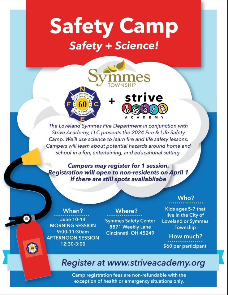 Registration is open for the 2024 Safety Camp! This popular program is hosted by the Loveland-Symmes Fire Department and Strive Academy. Enrollment is open to City of Loveland and Symmes Township residents ages 5-7.